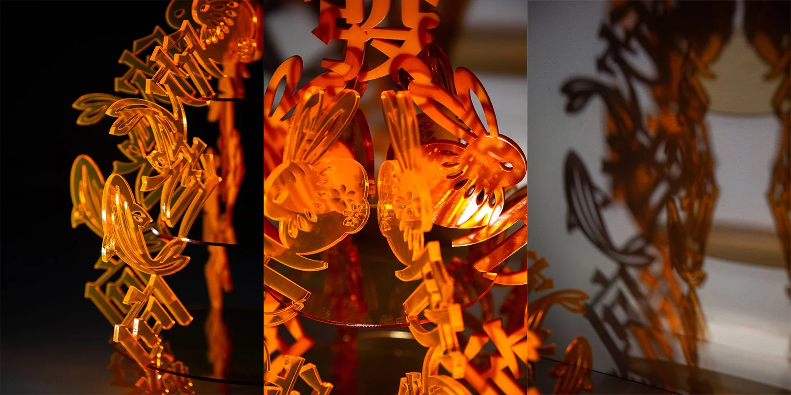Based on huamo customs for housewarming and business, this orange acrylic sculpture channels wishes for momentum and prosperity. Featuring “發” (to prosper), fish, and a rabbit, it reflects the folk phrase “九鱼一兔,越住越富” (nine fish and one rabbit bring growing fortune) and the upward energy of thriving beginnings.