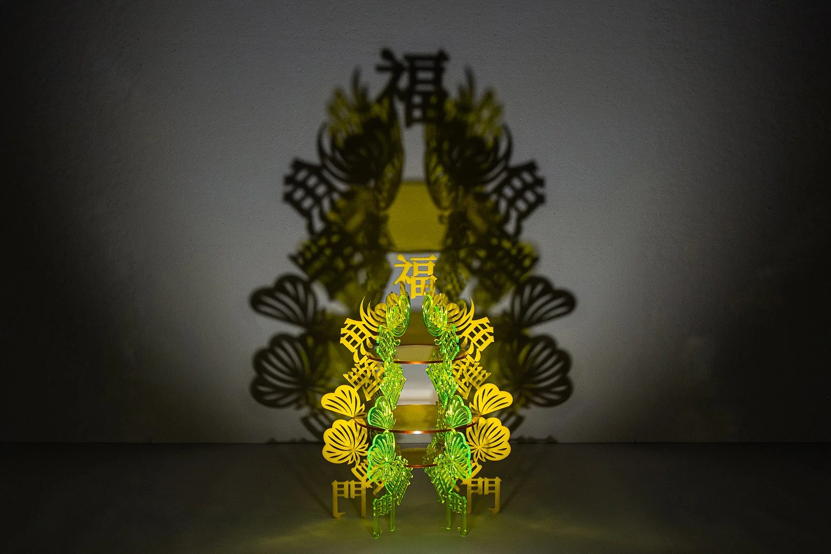 Inspired by the full moon, this yellow acrylic sculpture symbolizes welcome, protection, and hope for a newborn. Featuring “福” (blessing), pomegranates, and Buddha’s hand, it draws from huamo traditions that encircle life with layered care and generational connection.