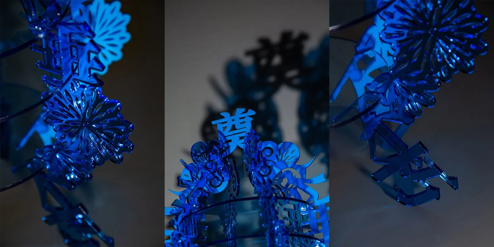 Inspired by mourning traditions, this blue acrylic sculpture centers on the character “奠” (offering in mourning), surrounded by chrysanthemums and cloud motifs. Drawing from huamo practices of quiet remembrance, it honors the departed with calm, layered forms that suggest breath, return, and a reverent farewell.