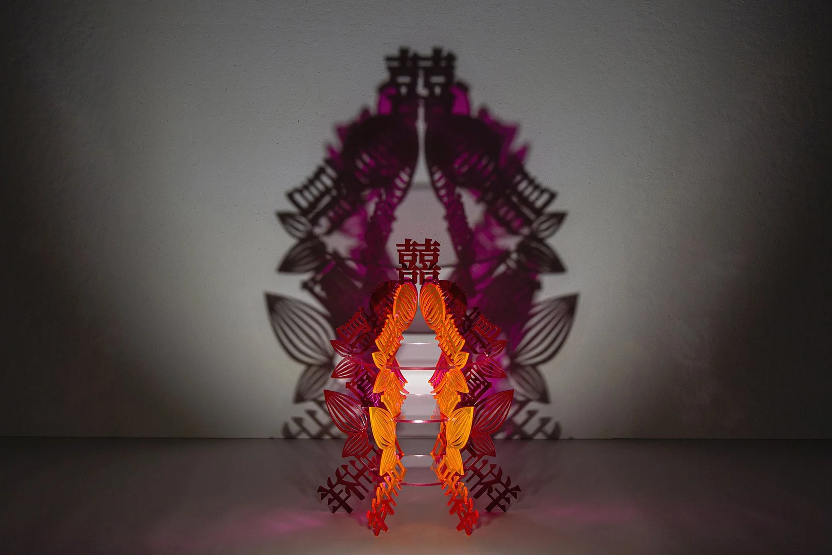 Featuring “囍” (double happiness), lotus pods, and pomegranates, this red acrylic sculpture draws from wedding huamo traditions that center on reciprocal exchange. Symmetrical and interlocking, the form reimagines union as shared rhythm, offering blessings for connection, continuity, and care.