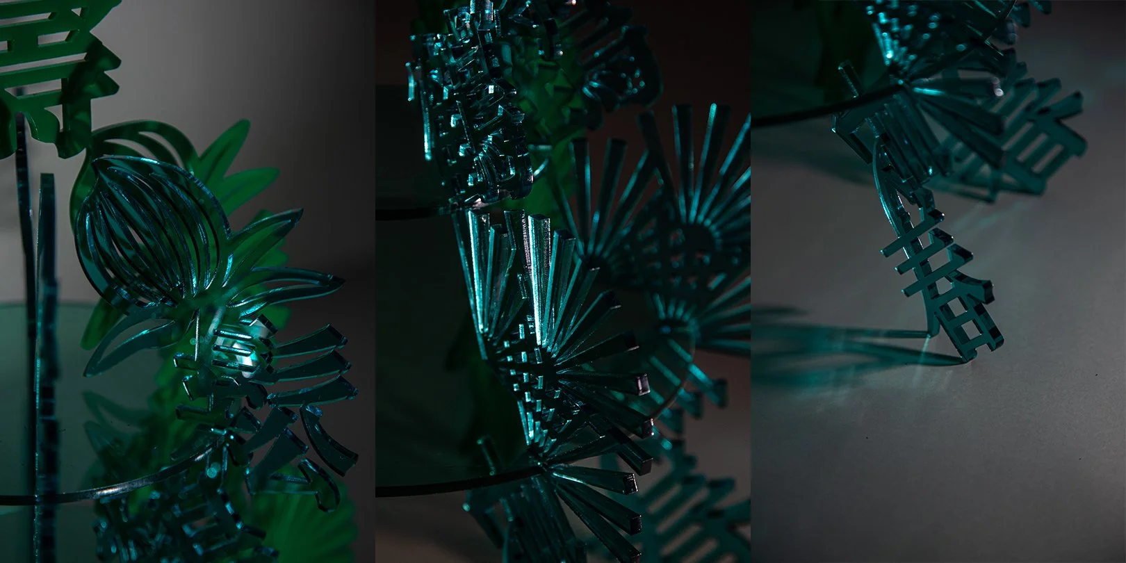 This green acrylic sculpture draws on birthday traditions honoring elders. Featuring “寿” (long life), pine leaves, and a peach, it interprets longevity not only as age, but as lasting vitality and connection across generations. Inspired by idioms like “松鹤长春,” the form stretches outward like growing branches, evoking strength, grace, and renewal.