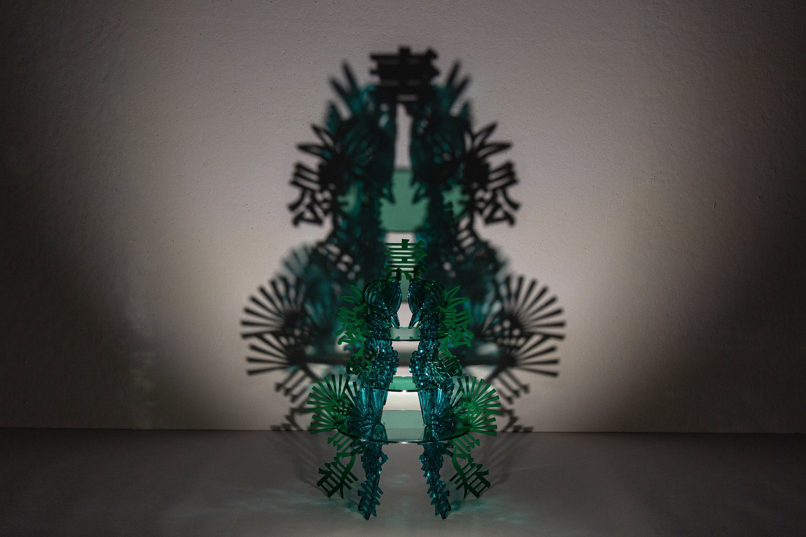 Colored acrylic under directed lighting, casting layered shadows that extend the symbolic forms.