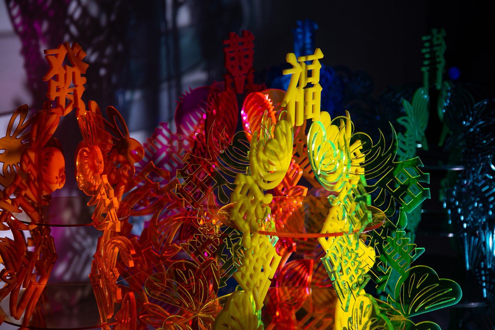 A close-up showing symbolic elements across all five ritual sculptures. Pomegranates, rabbits, peaches, fish, and chrysanthemums intertwine—each shape cut in colored acrylic, layered and illuminated to highlight shared motifs across life stages.
