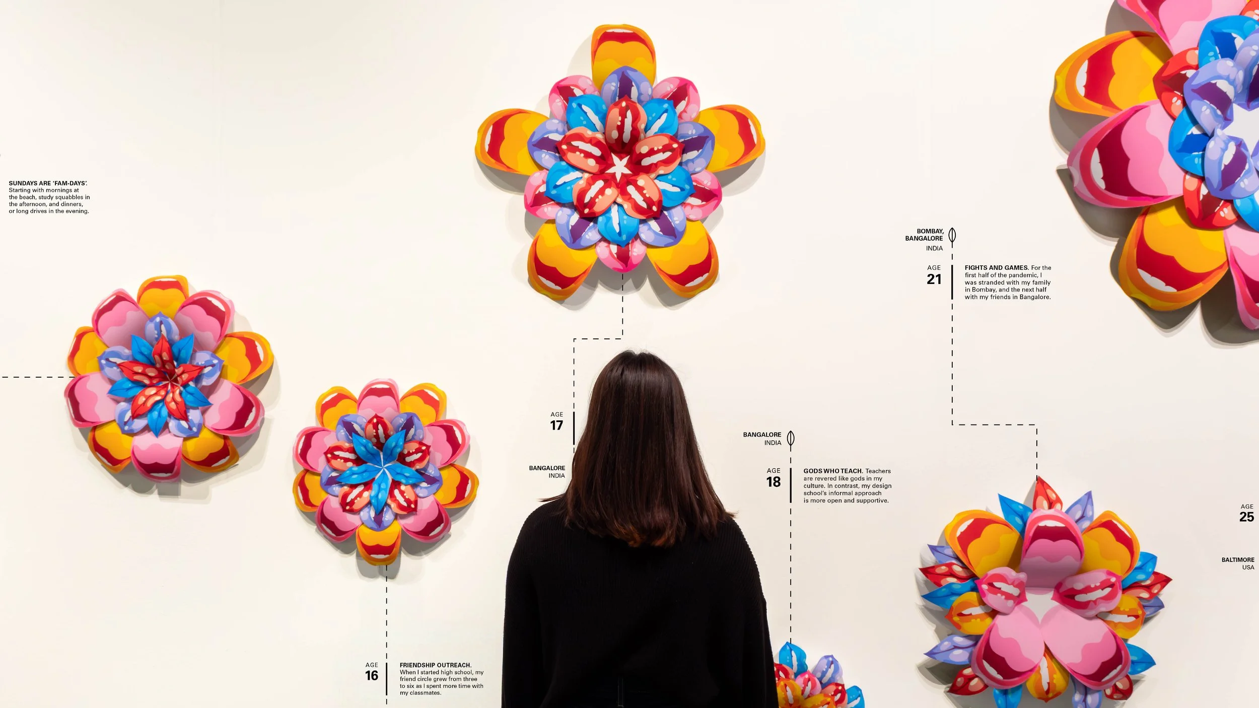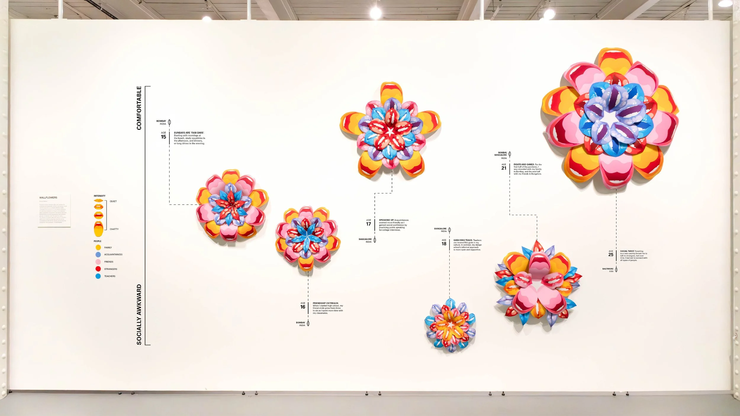 Flowers convey feelings often left unsaid. As someone who gradually shifted from being a quiet child to one who is no longer afraid to speak, I mapped the evolution of my talking patterns through the metaphor of flowers. This physical data visualization documents the factors that have transformed my social relationships with different groups of people over the past ten years. The hand-cut petals take the shape of mouths, with colors symbolizing the intensity of my conversations with family, friends, acquaintances, professors, and strangers.